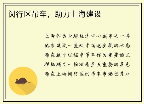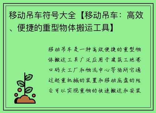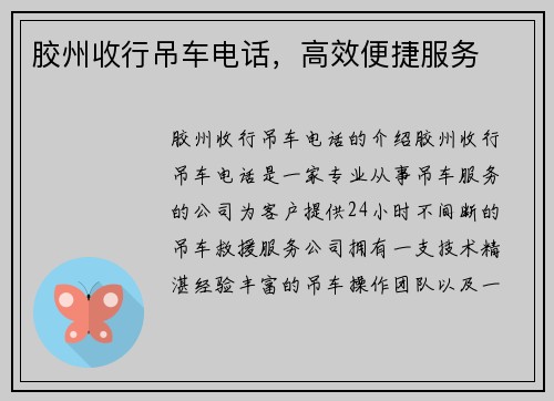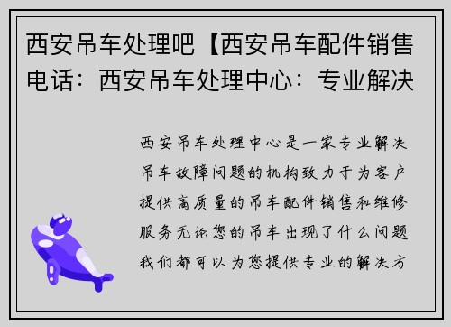 重庆中联吊车配件电话是一家专业从事吊车配件销售的公司,为各类吊车提供高质量的配件和服务。如果您需要吊车配件或有关吊车的问题需要咨询,可以拨打他们的电话,他们将竭诚为您提供帮助。 公司背景 重庆中联吊车配件电话成立于2005年,拥有多年的吊车配件销售经验,为客户提供全方位的吊车配件解决方案。公司的宗旨...